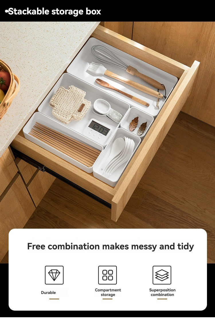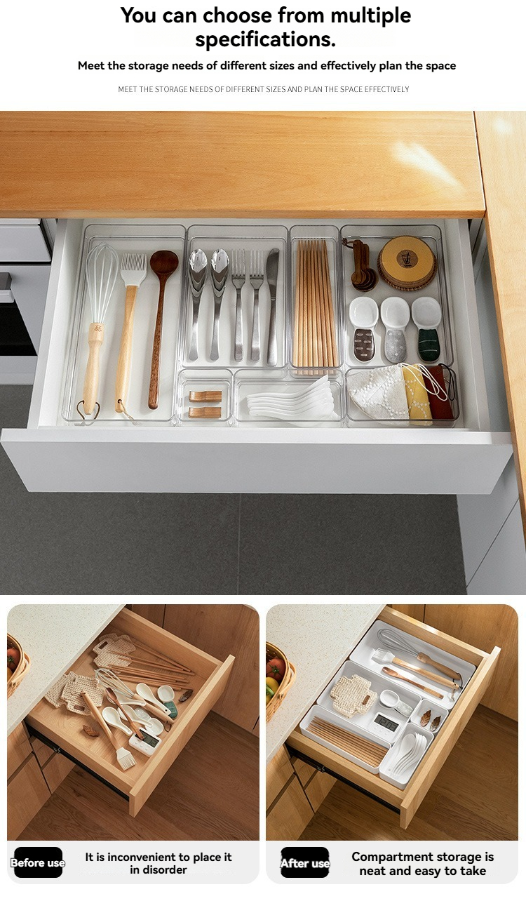 Drawer Partition Storage Box - This Japanese-style rectangular transparent organizer is crafted from 100% new PET plastic, designed for multi-scene storage in drawers, tables, kitchens, dining rooms, and living rooms. Featuring divided compartments and stackable functionality, it can be freely combined in various ways to organize tableware, chopsticks, stationery, cosmetics, and other small items. With a 1L capacity, the transparent design allows easy visibility of stored contents, while the durable PET material ensures sturdiness and long-term use. Its solid-color appearance complements Japanese-style decor, keeping your space neat and organized by maximizing storage efficiency.